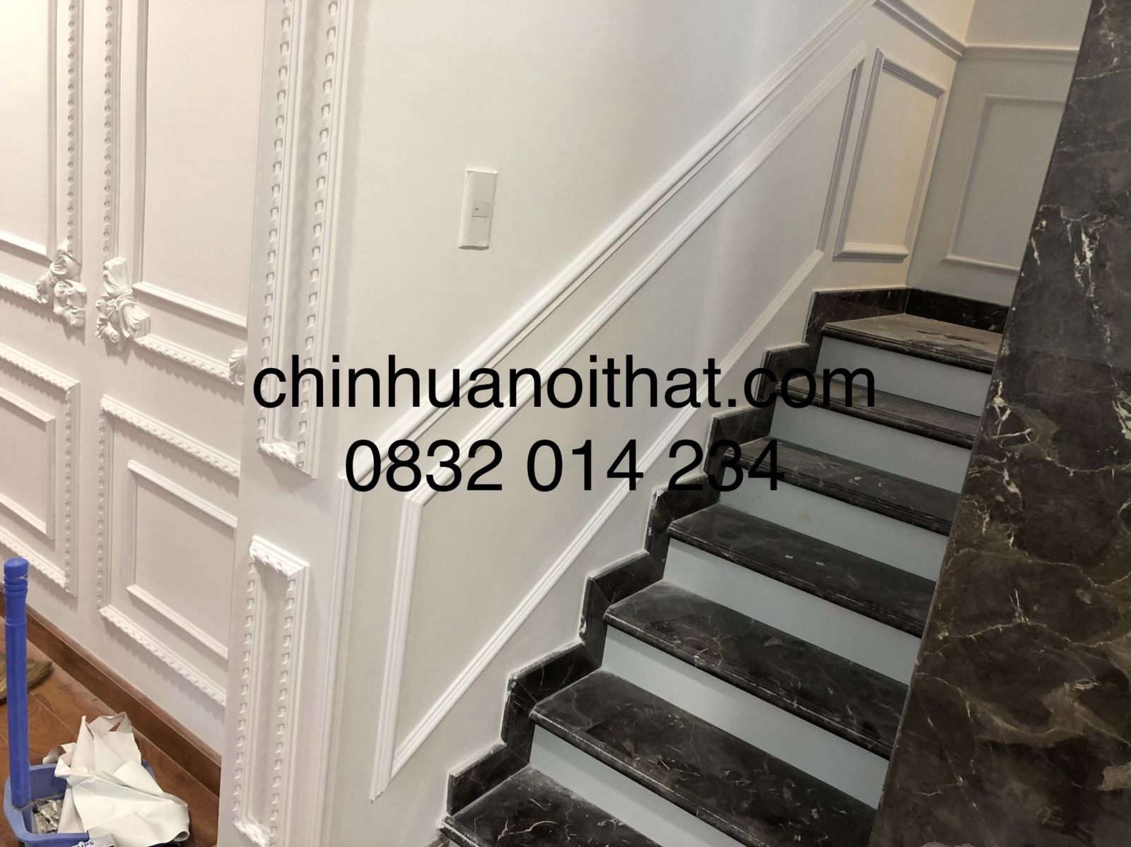 Cầu thang với thiết kế sang trọng, cao cấp kết hợp phào chỉ Pu sơn trắng làm tăng thêm sự sang trọng, đẳng cấp cho ngôi nhà